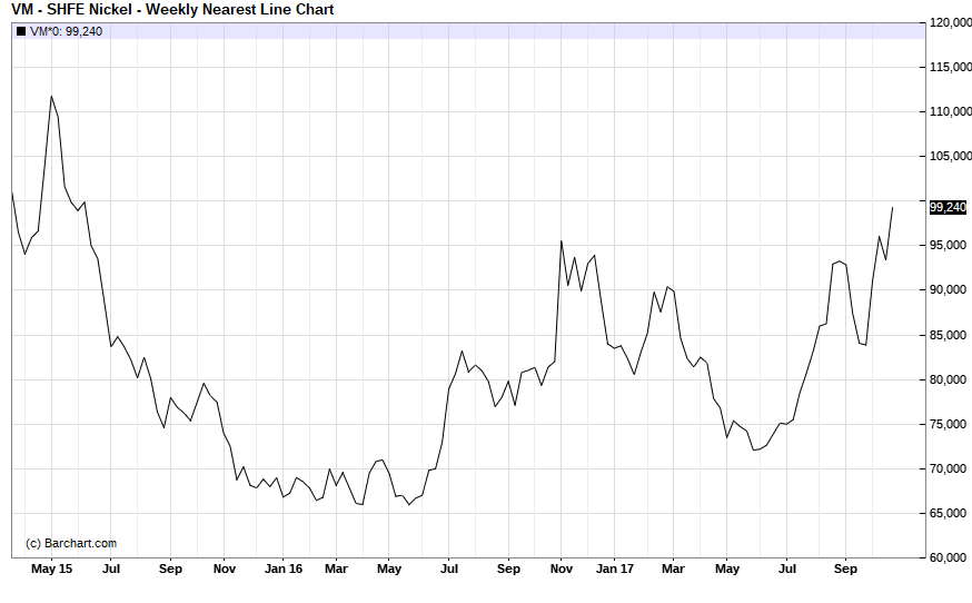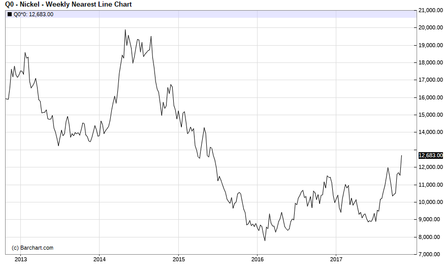 Quotazioni del nichel in forte ripresa, nelle maggiori borse del mondo. Il metallo quotato al London Metal Exchange si avvicina ormai all’area dei 13.000$ a tonnellata, per la prima volta da oltre due anni, come si può vedere dal grafico che segue.